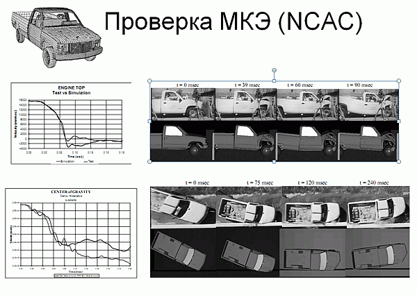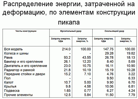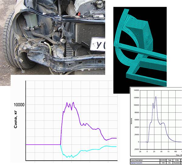 На рисунке – сравнение двух натурных экспериментов на удар в стену и на удар в барьерное ограждение дороги. В верхних рядах слайды с фотографиями натурного эксперимента, в нижних – расчёт методом конечных элементов. Результат по затратам энергии сведён в таблицу.