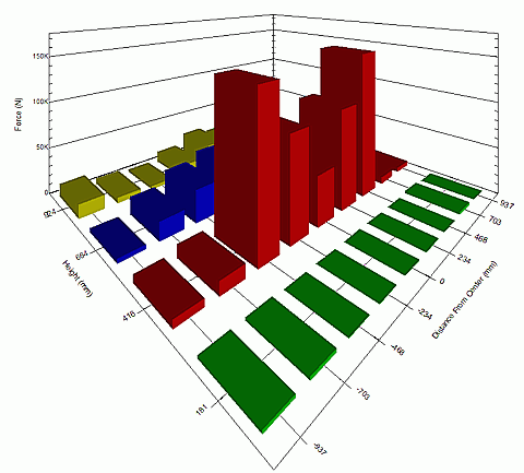 И такие графики можно выдать отдельно по каждой из 36 ячеек барьера. Вот как выглядит распределение пиковой нагрузки в ячейках барьера (на рисунке ближний ряд с зелёными прямоугольниками – ряд ячеек «А», что ниже усилителя бампера, красный ряд – ряд «В» на высоте усилителя бампера и т.д.).