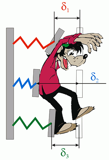 В результате удара красная пружина, имеющая жёсткость k1, сжалась на величину d1, синяя с жёсткостью k2 – на величину d2, зеленая с жёсткостью k3 – на величину d3. Тогда силы сопротивления этих пружин во время деформации росли от нуля до P1=k1d1, P2=k2d2 и P3=k3d3. Отсюда величина энергии, затраченная на деформацию каждой пружины, составила ½ P1d1, ½ P2d2 и ½ P3d3. Просуммировав эти величины, найдём энергию, затраченную на деформацию всего препятствия. Тогда скорость Волка в момент удара в препятствие можно найти из равенства величины энергии деформации кинетической энергии Волка в момент удара mv2/2.Все просто и ясно.