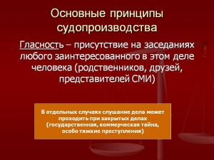 Гласность при осуществлении правосудия подразумевает осуществление ниже приведенных основополагающих принципов .