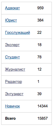 Вот жаль на сайте нет данных сколько всего зарегистрированно адвокатов, юристов, прокуроров, судей, просто статистика.