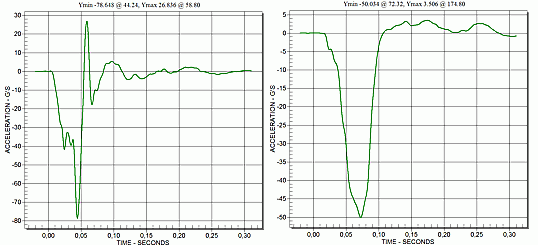 Первое – это датчики. В «Основоположнике» показан краш-тест автомобиля Nissan Pathfinder. Кроме штатных сенсоров он, естественно, был напичкан дополнительными. На рисунке ниже слева – график ускорения с датчика на двигателе, справа – с датчика на груди манекена на переднем правом сиденье.