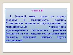 В соответствии со ст. 41 Конституции РФ каждый имеет право на охрану здоровья и медицинскую помощь. Медицинская помощь в государственных и муниципальных учреждениях здравоохранения оказывается гражданам бесплатно за счет средств соответствующего бюджета, страховых взносов, других поступлений. Государство гарантирует охрану здоровья каждого человека в соответствии с Конституцией РФ.