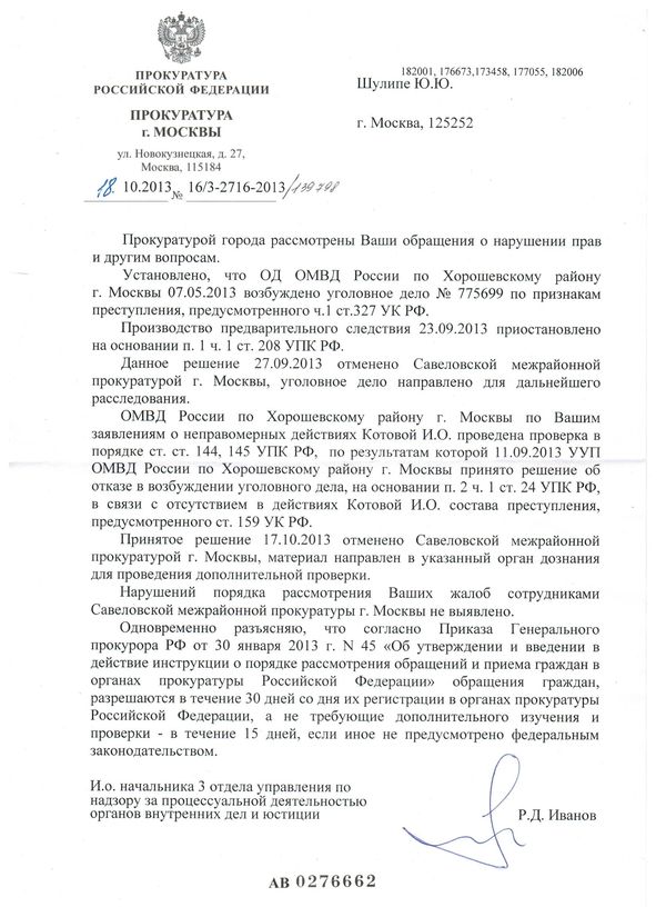Об этом прямо указано в отписке, что нарушений порядка рассмотрения моих жалоб сотрудниками Савеловской межрайонной прокуратуры не выявлено. Это притом, что на 6 (шесть) поданных мною еще в сентябре жалоб в порядке ст. 124 УПК РФ в адрес Савеловского межрайонного прокурора вынесено только одно (!) незаконное, необоснованное и немотивированное постановление, на которое я подал жалобу, по которой согласно этой же отписке умышленно не принято законных мер реагирования.