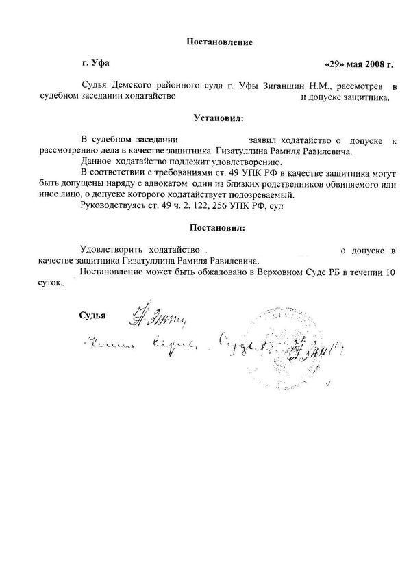 При этом, прежде чем вынести постановление, судья проводит судебное заседание, в котором рассматривает ходатайство о допуске близкого родственника или иного лица в качестве защитника обвиняемого. Согласно ч. 4 ст. 7 УПК постановление судьи должно быть законным, обоснованным и мотивированным. Эти требования распространяются на все постановления судьи, в том числе и о допуске в качестве защитника иного лица.