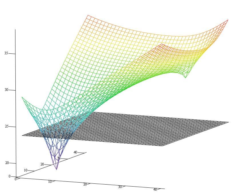 На рисунке ниже – трехмерная поверхность затрат энергии и плоскость уровня 23.765 Дж. Начало координат здесь смещено в точку (-1, -1), по осям абсцисс и ординат размеры в дециметрах. То есть реальная точка столкновения — это (10,10).