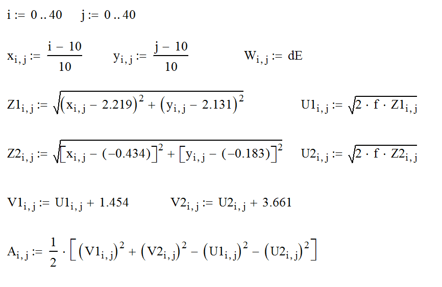 Рассмотрим область, в разумных пределах, от х=-1 до х=3 и от y=-1 до y=3, или размером 4х4 метра. В каждой точке (x,y) области с шагом 0.1 м определим Z1 – расстояние от этой точки плоскости до конечного положения материальной точки №1, и Z2 – расстояние от этой точки плоскости до конечного положения материальной точки №2.