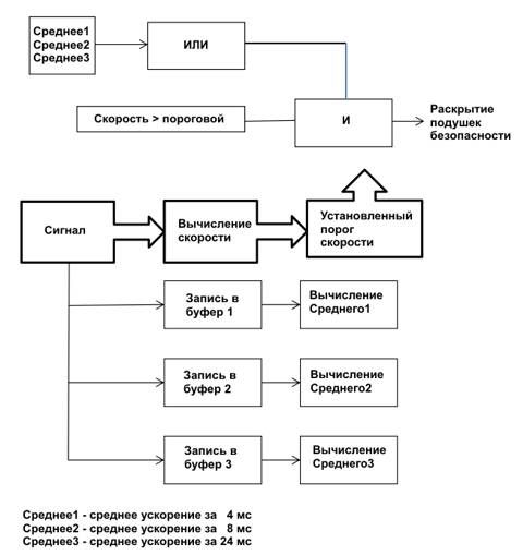 Модуль управления подушки безопасности (ACM) получает непрерывный сигнал от каждого датчика MEMS и записывает данные в течение определенного периода после специфического события. С помощью центрального процессора (CPU) он выполняет алгоритмические вычисления и дает или не дает команду для развертывания подушки безопасности. Алгоритмы определения степени тяжести удара работают путем оценки одного или нескольких кинематических параметров (ускорение, его производных или интегралов), список которых приведен приведены в таблице 1 ниже. Примеры блок-схем алгоритмов принятия решения показаны на следующих рисунках.Таблица 1.
