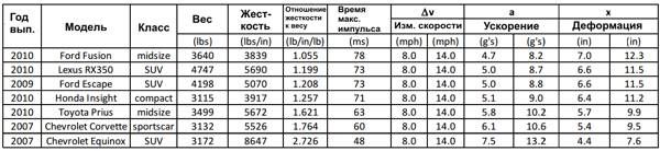 Таблица 2 показывает соответствующий спектр замедлений и деформаций (перемещений) в краш-тестах на фронтальный удар, для автомобилей, на которых имеются подушки безопасности, учитывая расчетное время для максимального импульса удара и для различных автомобилей по жесткости и массе.
