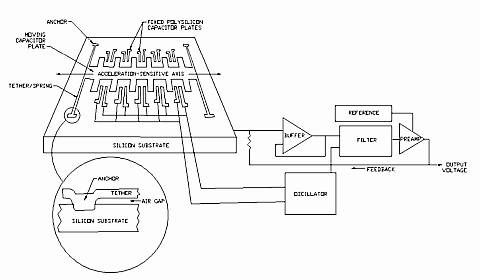 Новые датчики MEMS удара измеряют ускорение акселерометром, который посылает непрерывный поток данных в модуль управления подушки безопасности. Акселерометры, как правило, пьезоэлектрические или переменно емкостные датчики. Наиболее распространенным MEMS акселерометр, который используется сегодня, ADXL-50 производства Analog Devices.