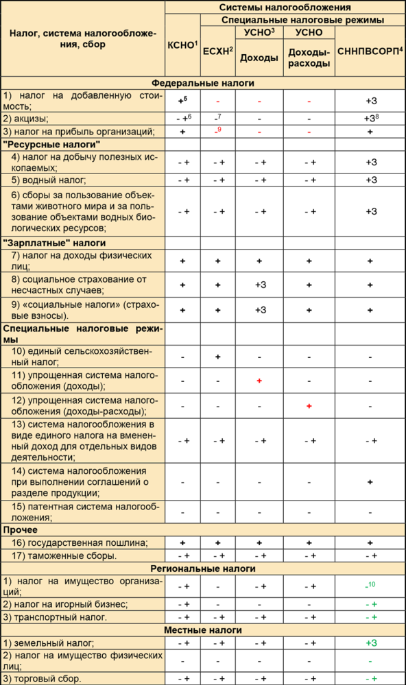 Из вышеприведенной таблицы видно, что использование какой-либо системы налогообложения не означает полный запрет на применение налогообложения (налогов) из другой системы. Например: