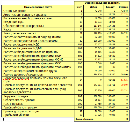 В завершении, приведем оборотно-сальдовую ведомость, из которой очевидно, что будет отражено в балансе, отчете о финансовых результатах, отчете о целевом использовании средств, отчете о движении денежных средств: