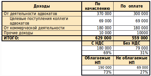 Обратите внимание на следующие аспекты:- Не смотря на то, что в кассу и на расчетные счета коллегии адвокатов поступило всего 559 тысяч рублей, в расчетах мы будем учитывать все начисления в размере 629 тысяч (т.е. у коллегий адвокатов на общей системе налогообложения по умолчанию нет кассового метода учета доходов).