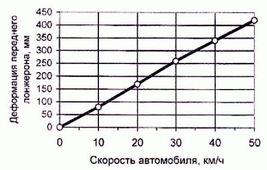 Эксперт сослался на экспериментальные данные А.В. Лемешкина, приведенные им в автореферате диссертации «Разработка экспертной системы определения скорости столкновения автомобиля по деформации силовой структуры кузова». Там, якобы, есть вот такой график зависимости деформации переднего лонжерона автомобиля от скорости удара в жесткое недеформируемое препятствие.