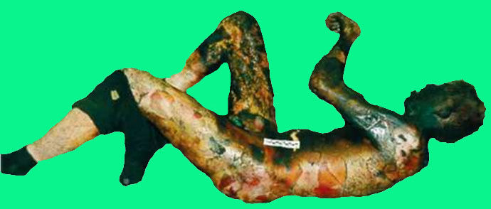 Рис. Обгорание мягких тканей с обнажением брюшной полостиИногда при посмертном действии пламени на коже образуются пузыри, которые по внешнему виду идентичны прижизненным, образующимся при ожогах второй степени, однако имеют другой механизм образования. При посмертном действии пламени происходит вскипание межклеточной жидкости, лимфы и жидкой части крови, что приводит к утрате межклеточных связей и отслоению эпидермиса.