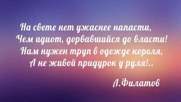 Уважаемый Владислав Александрович, я не противник власти как таковой, и в последнее время сильно охладел к лозунгам демократии, народовластия, и всеобщего равенства, т.к. вижу, что абсолютному большинству электората на это наплевать — каждый заботится только о себе.