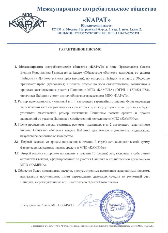 P.S.: пока мы между судами бегали, мне пришлось со многими пообщаться по этому Обществу и бытует мнение одно — готовятся к банкротству и всем об этом говорят. Кроме того, появилось новое аналогичное общество «Карат», которое выдает всем гарантийное письмо о том, что принимает на себя все обязательства по долгам «Камены» и всем пайщикам выплатят деньги в течение (ВНИМАНИЕ!!!) 3-х и 10-ти лет.