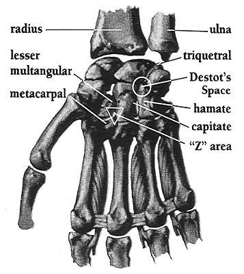 рис. Пространство Десто. В случае, если гвоздь забивался в расположенное между трехгранной, головчатой и крючковидной костями запястья, пространство Десто полностью отвечает требованиям, руки распятого надежно удерживалось на кресте независимо от его массы тела.