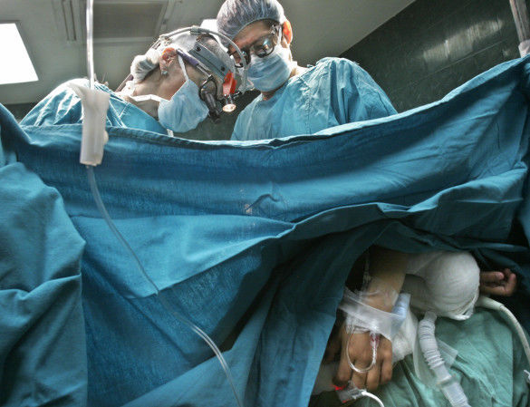 Небольшая комната, врач на круглом стуле с зеркалом и маской, столы накрытые коричневыми простынями. Белое железное кресло как в американских тюрьмах для смертников.