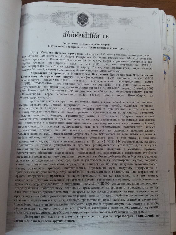 Скажу более, в архиве моих уголовных дел имеется фото нотариальной доверенности, где нотариус уполномочил Управление на транспорте МВД РФ по Сибирскому Федеральному округу представлять интересы потерпевшей (физического лица) в уголовном процессе.