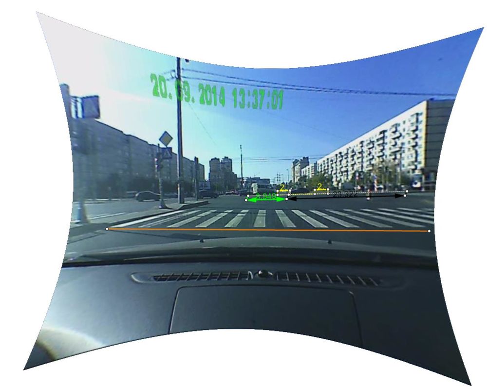 Уважаемый Герман Николаевич, спасибо за интересный материал. Внесу только немного от себя, как от автотехника. При экспертизах по ДТП зачастую не требуется высокая точность измерений. Что наглядно продемонстрировано в осуждаемой вами статье Владимира Николаевича. Допустимость метода Владимира Николаевича он продемонстрировал выехав на место ДТП и произведя замеры вручную, подтвердив правильность замеров на компьютере. По вашей фотографии тут допускаю и в 2 раза может быть разница в измерениях. Но возьмите любой видеорегистратор. Нет там столь сильных искажений, и тем более от лобового стекла ТС.