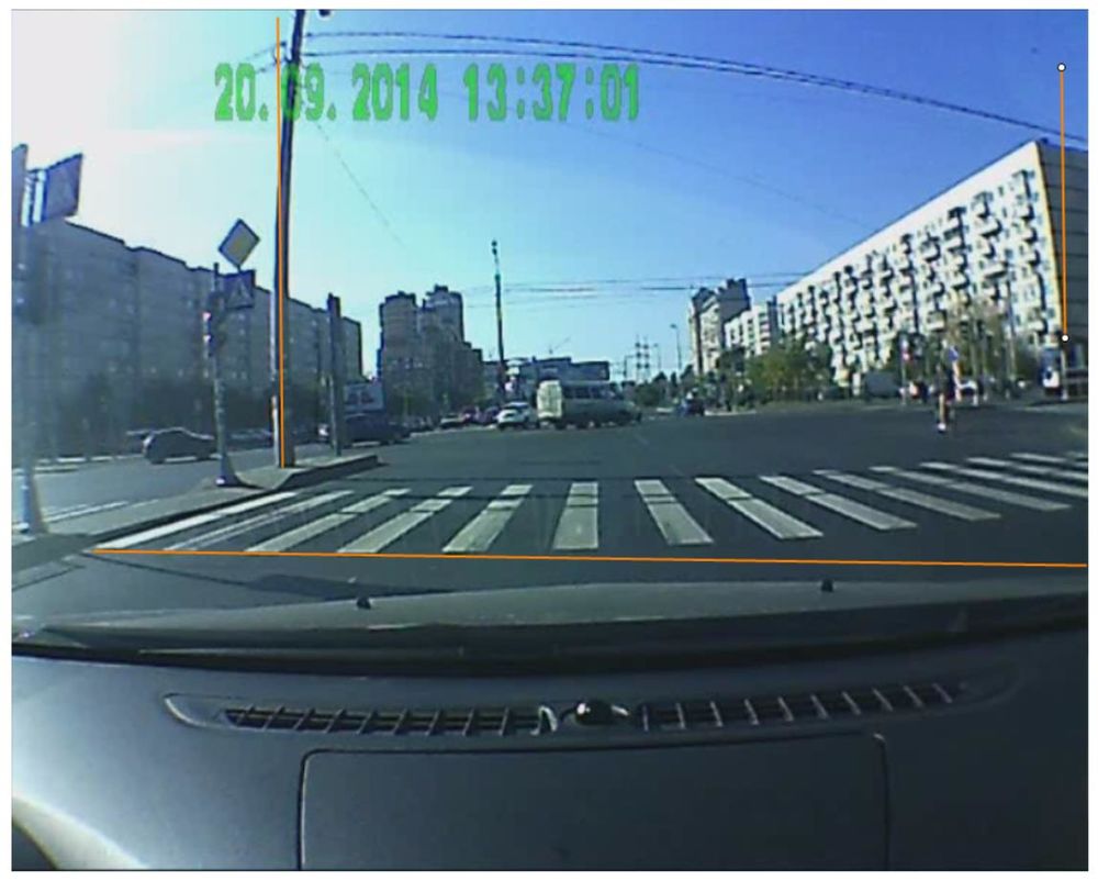 3) Ок. Я взял кадр видео с автомобильного видеорегистратора. Смотрим на оранжевые прямые, проведенные вдоль «прямолинейных» в реальности элементов объектов в кадре. Несмотря на все усилия, разметка перехода осталась искаженной по причине доп. искажений, привносимых лобовым стеклом.