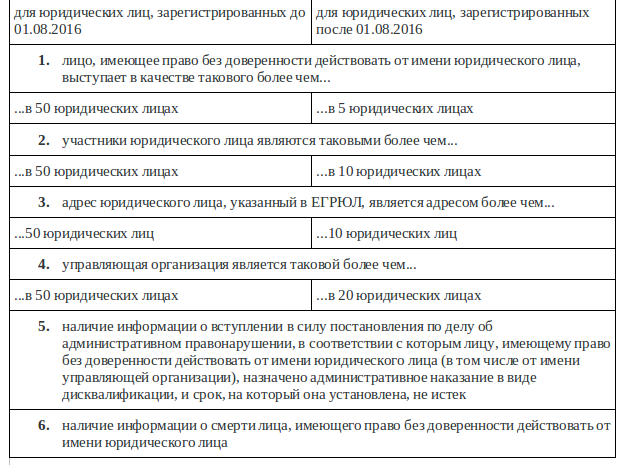 - от Управлений Федеральной налоговой службы по субъектам Российской Федерации о юридических лицах, имеющих «признаки недостоверности включенных в ЕГРЮЛ сведений», названные ФНС России в Письмах от 03.08.2016 N ГД-4-14/14126@ «О проведении работы в отношении юридических лиц, зарегистрированных после 1 августа 2016 года и имеющих признаки недостоверности» и от 03.08.2016 N ГД-4-14/14127@ «О проведении работы в отношении юридических лиц, зарегистрированных до 1 августа 2016 года и имеющих признаки недостоверности»;