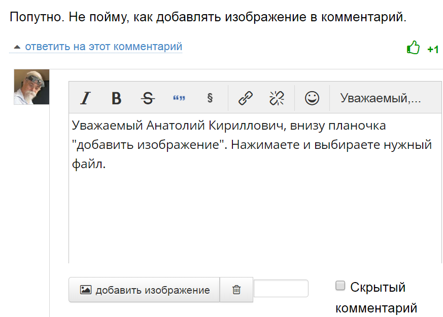 Уважаемый Анатолий Кириллович, внизу любого коммента есть такой значок в виде иконки и надпись «добавить изображение». Когда тыкните в него появиться возможность выбрать файл и вставить (файл должен быть не слишком большой, предварительно его нужно скачать на комп и это должен быть формат jpg). Когда выберите файл, то можно завершить набор текста в комменте и тыкнуть на зелёную кнопку «сказать» внизу. Коммент будет с изображением. К сожалению изображение будет всегда внизу коммента и при редактировании коммента изображение уже вставить нельзя (можно обратиться в техподдержку, чтоб устранили это, но можно просто делать дополнительный коммент и не заморачиваться).