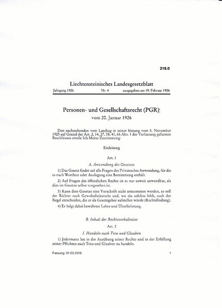 [4] Personen- und Gesellschaftsrecht (PGR) vom 20. Januar 1926// Liechtensteinisches Landesgesetzblatt: Jahrgang 1926 Nr. 4 ausgegeben am 19. Februar 1926