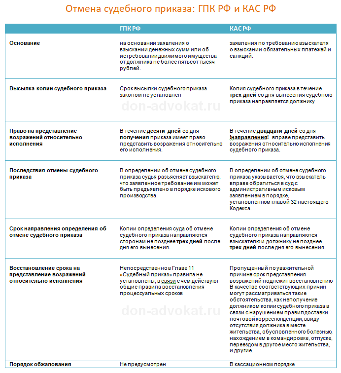 В приложенном к статье файле – таблица особенностей отмены судебного приказа по ГПК И КАС РФ.