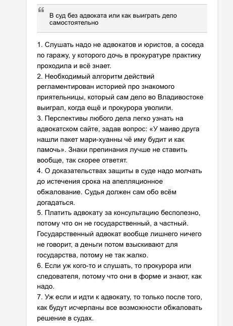 Уважаемый Андрей Валерьевич, Спасибо за отзыв! Ну если человек способен читать и вникать — уже для многих недостижимая высота. Вы молодец, но таких мало. Помню, когда я работал в прокуратуре Адвокатский корпус был сильнее, мне нравилось как адвокат умеет отстаивать позицию. Многому тогда я научился. Надо признать, что сейчас правоохранители лидируют. Они не разобщены, их обучают. У нас по сути есть лишь «Праворуб».