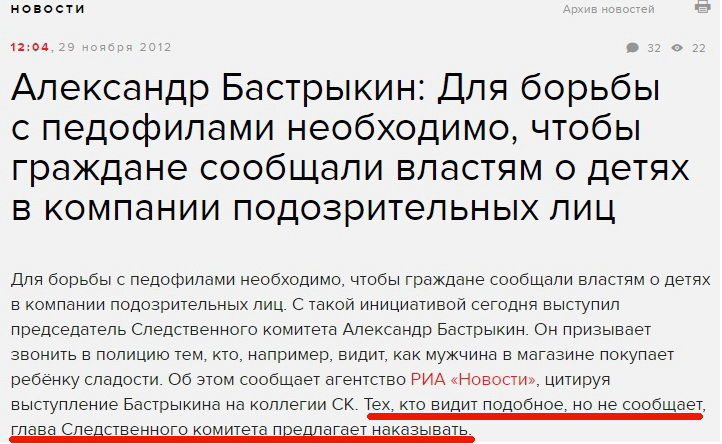 Однако, был в нем интересный эпизод. Осознавая сложность пихания следователей в зад, свою работу по делу я начал с того, что во все инстанции раскидал «грозные письма»: «взять на контроль...», «обратить внимание...», «с целью недопущения...» и т. п. Артподготовка, в общем. Чтоб земля под ногами горела. Но не учел политический момент, а именно — объявленную Бастрыкиным А. И. накануне войну педофилам. Со всеми вытекающими в виде изменений в Уголовный кодекс РФ, усиливающих наказание и усложняющих от него освобождение.