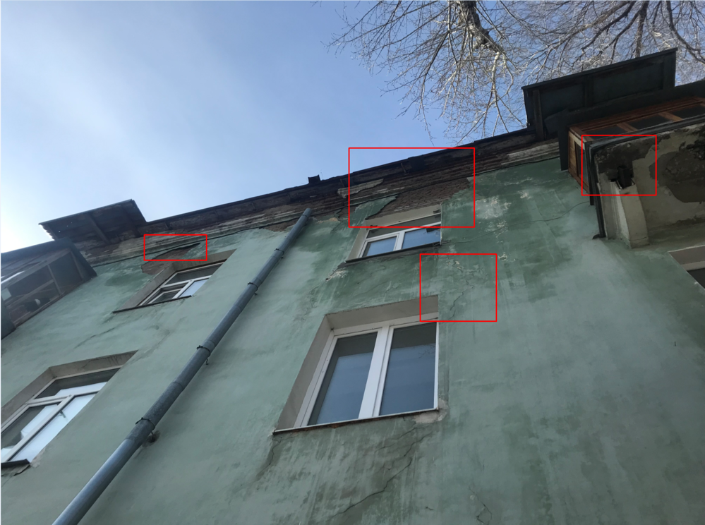 За 67 лет конструктивные элементы дома основательно «поистрепались». И крыша, и фасад, и фундамент, и инженерные коммуникации. Имеются многочисленные трещины, длиной до 3-х метров и шириной раскрытия более 1 см, следы отслаивания и обрушения обширных участков фасада с оголением кирпичной кладки наружных ограждающих конструкций, следы растрескиваний, отслаивания и разрушения декоративных элементов отделки, следы разрушения бетона балконных плит с оголением рабочей арматуры, следы вспучивания, отслаивания и разрушения цокольной части фасада, и т.д. и т.п.