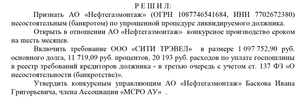6. После вывода денежных средств АО «Нефтегазмонтаж» объявлено неплатежеспособным, инициирована процедура «управляемого» банкротства (при том, что размер дебиторской задолженности подконтрольных организаций составил на момент открытия конкурсного производства порядка 1,2 миллиарда рублей);
