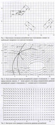 Заметим, что в силу закона сохранения количества движения вектор суммарного количества движения не изменяется при ударе как по направлению, так и по величине. Поскольку угол между направлениями движения автомобилей в момент столкновения известен из транспортно-трасологического исследования, далее с использованием теоремы косинусов найдено множество точек, где на векторном поле (рис.3) это условие выполняется. В результате получена кривая 2, которая так же нанесена на рис.2. Тогда точка пересечения двух полученных кривых, обозначенная на рис.2 цифрой 3, и есть искомая из рис.1 точка. Только в этой точке обеспечивается как выполнение законов сохранения механики, так и геометрическое условие по углу взаимного расположения автомобилей в момент столкновения, а так же определены ориентация автомобилей на дороге и их скорости в момент столкновения.