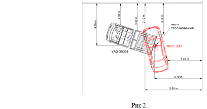 В программе PC Crash, в соответствии с предоставленной схемой ДТП и c использованием масштабных изображений автомобилей, была выполнена масштабная схема происшествия (рис.2).