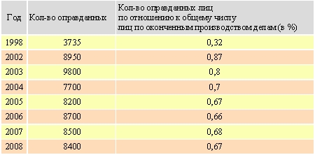 Данные по количеству оправданных лиц необходимо соотносить со статистикой отмененных оправдательных приговоров. На протяжении длительного времени этот процент остается весьма высоким. В 1994 г. по районным судам РФ данный показатель составил 25,9 %, в 1995 г. – 27,9 %; в 1996 г. – 29,4 %; в 1997 г. – 33,1 %; в 1998 г. – 42,9 %; в 2005 г. – 35,9%; в 2006 г. – 38,0%; в 2007 г. – 37,0%.