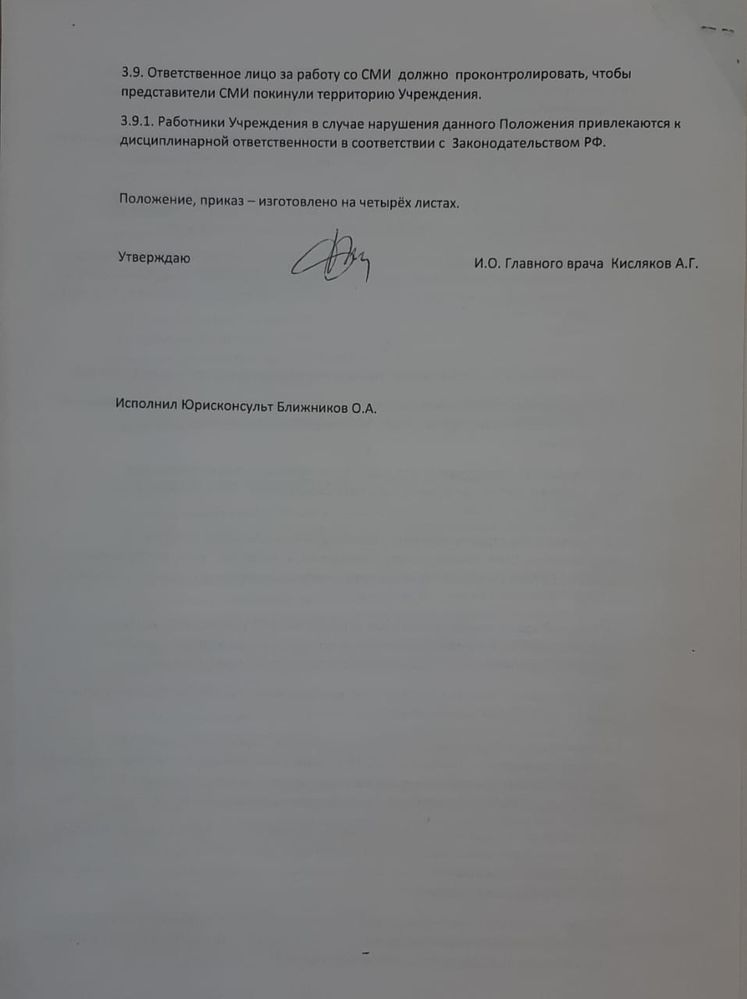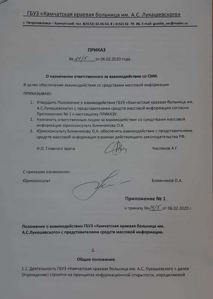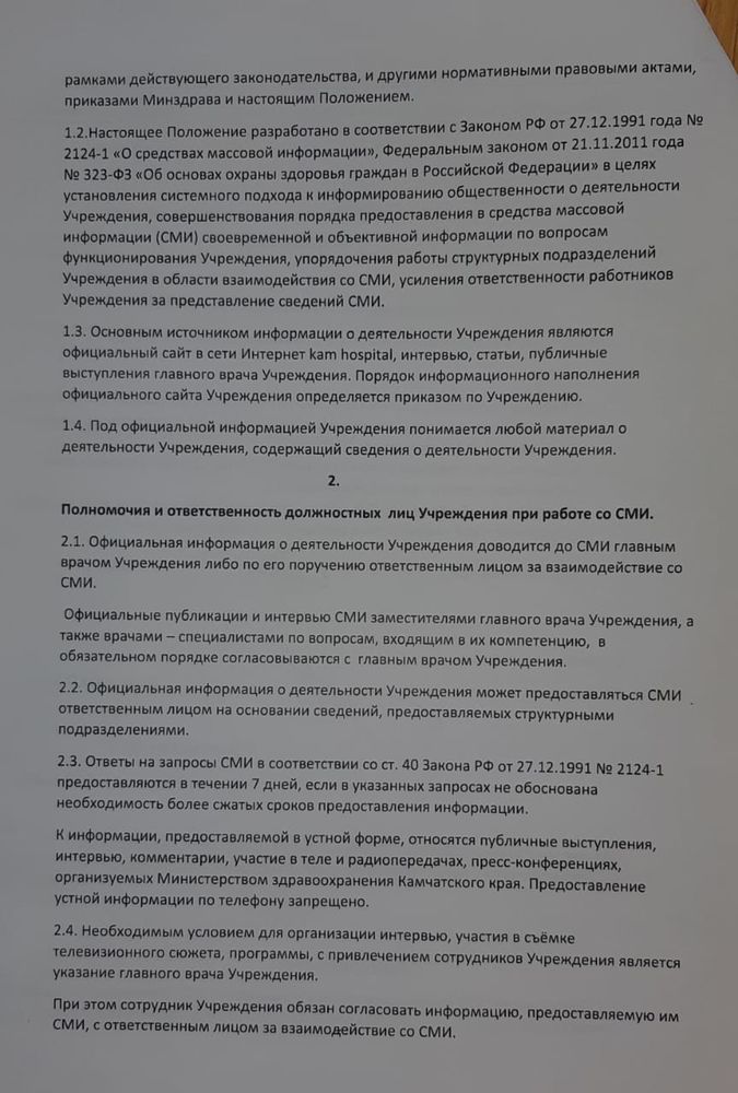 06 февраля 2020 года Исполняющий обязанности главного врача Камчатской краевой больницы Андрей Кисляков своим приказом № 21/5 утвердил Положение о взаимодействии больницы с представителями СМИ, которое является очень интересным с точки зрения соблюдения конституционного принципа свободы слова.