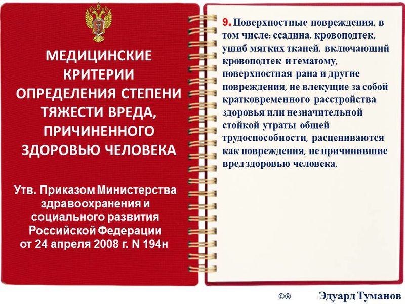 меня очень заинтересовал п. 9. (Поверхностные повреждения) Медицинских критериев определения степени тяжести вреда, причинного здоровью человека.