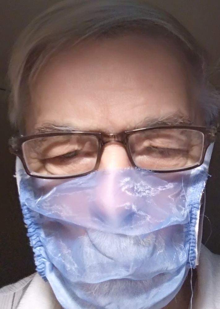 Сшил маску из синей сетки органзы от штор, и прикладываю её к лицу только возле кассы, чтобы не подводить кассира.