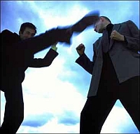 Супруги направились к двери, а Д. шёл сзади, выкрикивал в их адрес оскорбления и подталкивал в спины. На улице Д. продолжал оскорблять Е. и К., которые также не оставались в долгу. Когда Д. показалось, что слов для выражения его эмоций уже недостаточно, он сильно толкнул Е… Возмущённая женщина, защищая себя, толкнула Д… Толчёк был настолько сильным, что Д. упал. Вскочив, он схватил Е. за руку и сильно завернул её. Женщина упала, а Д. продолжал удерживать её руку. К. кинулся на подмогу жене и ударил Д. Испуганные дети кричали и плакали. На шум подошли люди и кинулись разнимать дерущихся. В это время подъехал на машине знакомый Е. и К… С большим трудом он разобрался в происходящем, заплатил продавцу магазина за купленный Е. шоколад, и супруги с детьми уехали с ним на машине домой.