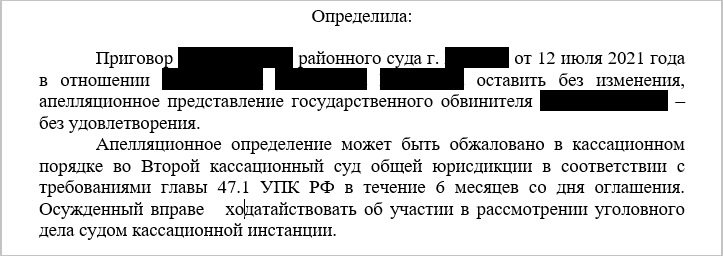 В результате судебная коллегия определила: приговор районного суда оставить без изменения, апелляционное представление государственного обвинителя — без удовлетворения.