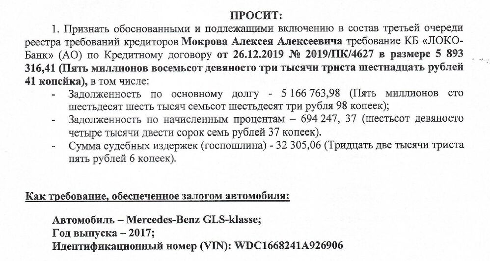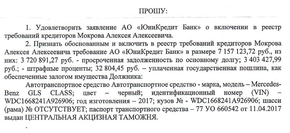 02.04.2022 приходит требование кредитора АО «Юникредитбанк» как требование… Обеспеченное залогом автомобиля МЕРСЕДЕС БЕНЦ GLS 250D 4MATIC, 2017 года выпуска,VIN WDC1668241A926906.