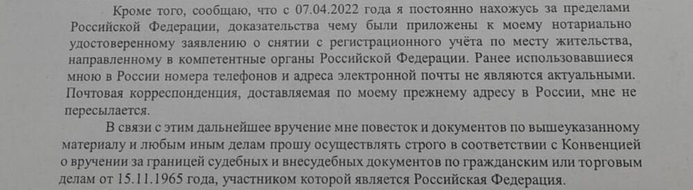 В своём ходатайстве, направленном в суд с того самого адреса электронной почты, который сам Калинин М.С. называет неактуальным, он сообщает, что якобы ещё 7.04.2022 г., он (кто бы мог подумать!) постоянно находится за пределами России, и просит направлять ему всю корреспонденцию исключительно в порядке установленном конвенцией от 15.11.1965 года, «О вручении за границей судебных и внесудебных документов по гражданским или торговым делам» (полный текст в приложении).