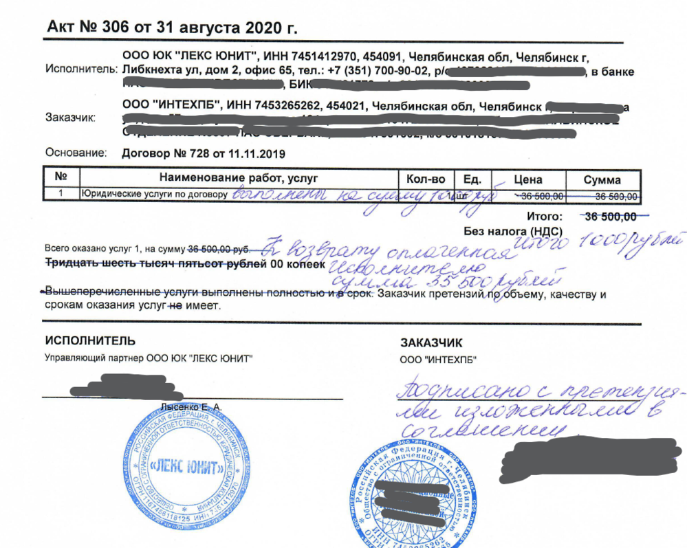 На обороте акта пропечатали претензию по услугам и потребовали возврата неосновательного обогащения. В соглашении о расторжении сделали подобным образом. Такие исправления со стороны заказчика были сделаны на основании п 2.1.4 договора «заказчик обязан подписать и направить исполнителю полученный от исполнителя акт об оказании услуг, или представить мотивированный ответ об отказе в подписании указанного акта, либо подписании с замечаниями в течение пяти календарных дней со дня получения акта».