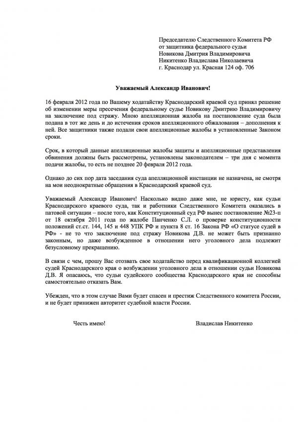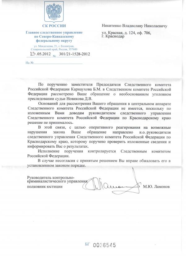 Маленькое дополнение, объективно отражающее всю абсурдность ситуации в целом. Владислав Николаевич передал мне копию своего обращения, адресованного в адрес Председателя СК РФ с просьбой отозвать ходатайство о возбуждении уголовного дела в отношении Новикова Д.В. Ответ поразил меня своей «обоснованностью», «логичностью» и, главное, неприкрытым желанием сбросить с себя груз ответственности за принимаемое решение. Судите сами: