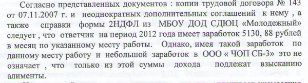 Решение суда, я считаю, абсолютно законное. Суть дела в следующем. Первоначально мы предъявили иск о взыскании алиментов совместно с иском о разделе имущества, что видно из определения о выделении исковых требований. До выделения требований, ответчик, чтобы доказать свои права на совместно нажитое имущество, как видно из протокола, несколько раз заявлял, что он «неофициально подрабатывал, все свои доходы не учитывал». В соответствии со ст. 55 ГПК РФ " Доказательствами по делу являются полученные в предусмотренном законом порядке сведения о фактах, на основе которых суд устанавливает наличие или отсутствие обстоятельств, обосновывающих требования и возражения сторон, а также иных обстоятельств, имеющих значение для правильного рассмотрения и разрешения дела. Эти сведения могут быть получены из объяснений сторон… "Ответчик пытался «усидеть на 2-х стульях»: доказать что в браке имущество приобреталось исключительно на его заработки, и сдругой стороны — что заработки его, что в браке, что сейчас — минимальные.