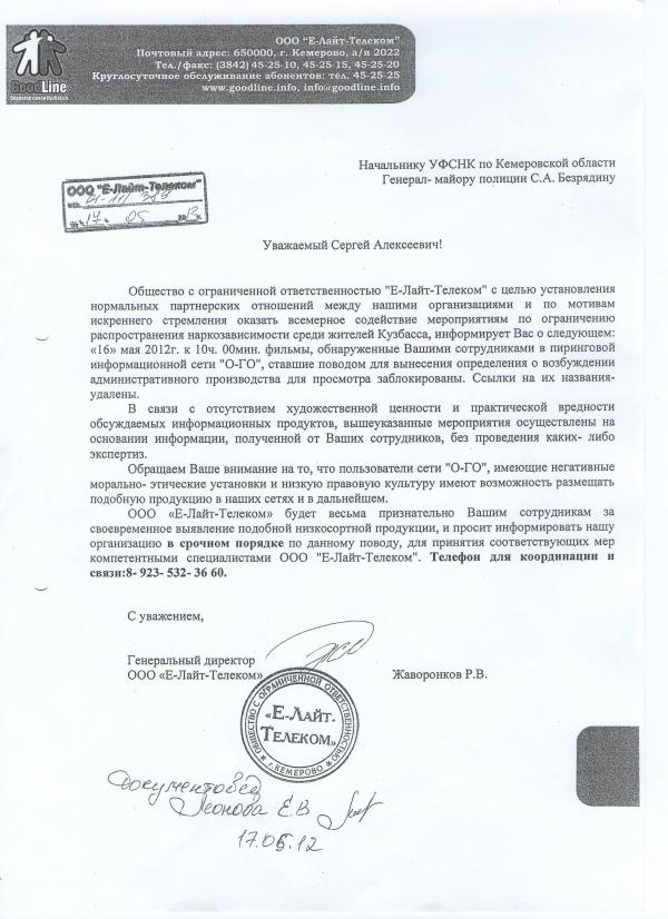 11 мая 2012 года представитель «Е-Лайт-Телеком» прибыл в штаб УФСКН по КО (Управление Федеральной Службы Контроля за Незаконным Оборотом Наркотиков по Кемеровской Области) и получил странный документ, утверждающий, что действия компании якобы являются пропагандой наркотиков. Поводом для столь серьезных обвинений стало обнаружение в файлообменной сети О-ГО фильмов: «Укуренные», «Травка», «Под кайфом и в смятении», «Игла». Как известно, пиринговые сети позволяют искать те или иные файлы на компьютерах пользователей, подключенных к этой сети. Обратите внимание, что пользователи сами делают выбор, какие файлы «открывать» на общий доступ, а какие нет. «Е-Лайт-Телеком» предоставляет своим абонентам лишь возможность присоединиться к сети О-ГО, но не контролирует действия своих клиентов. Прямых доказательств о ведении пропаганды именно компанией «Е-Лайт-Телеком» не было представлено.