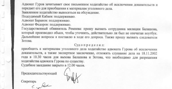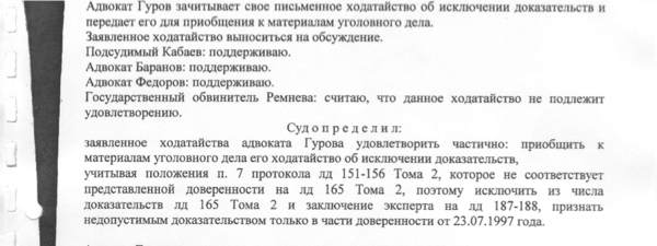 В результате, в ходе судебного заседания, стороной защиты было заявлено ходатайство об исключении доказательства — доверенности, которую следствие считало подлинной (приложение № 1). Итог: