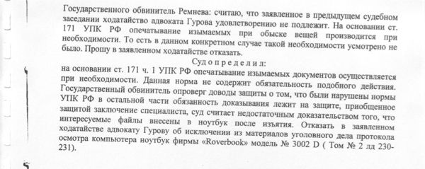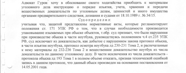 Начинаем исследовать обстоятельства обнаружения ноутбука. Обыск. Офис. Стол. Ноутбук. Изъятие. Стоп… Чей стол? Как изъяли ноутбук? Когда осмотрели? Что обнаружили? Кто автор? Ответов нет. Надо отдать должное государственному обвинителю, действительно старается разобраться и просит суд вызвать оперативника и следователя: